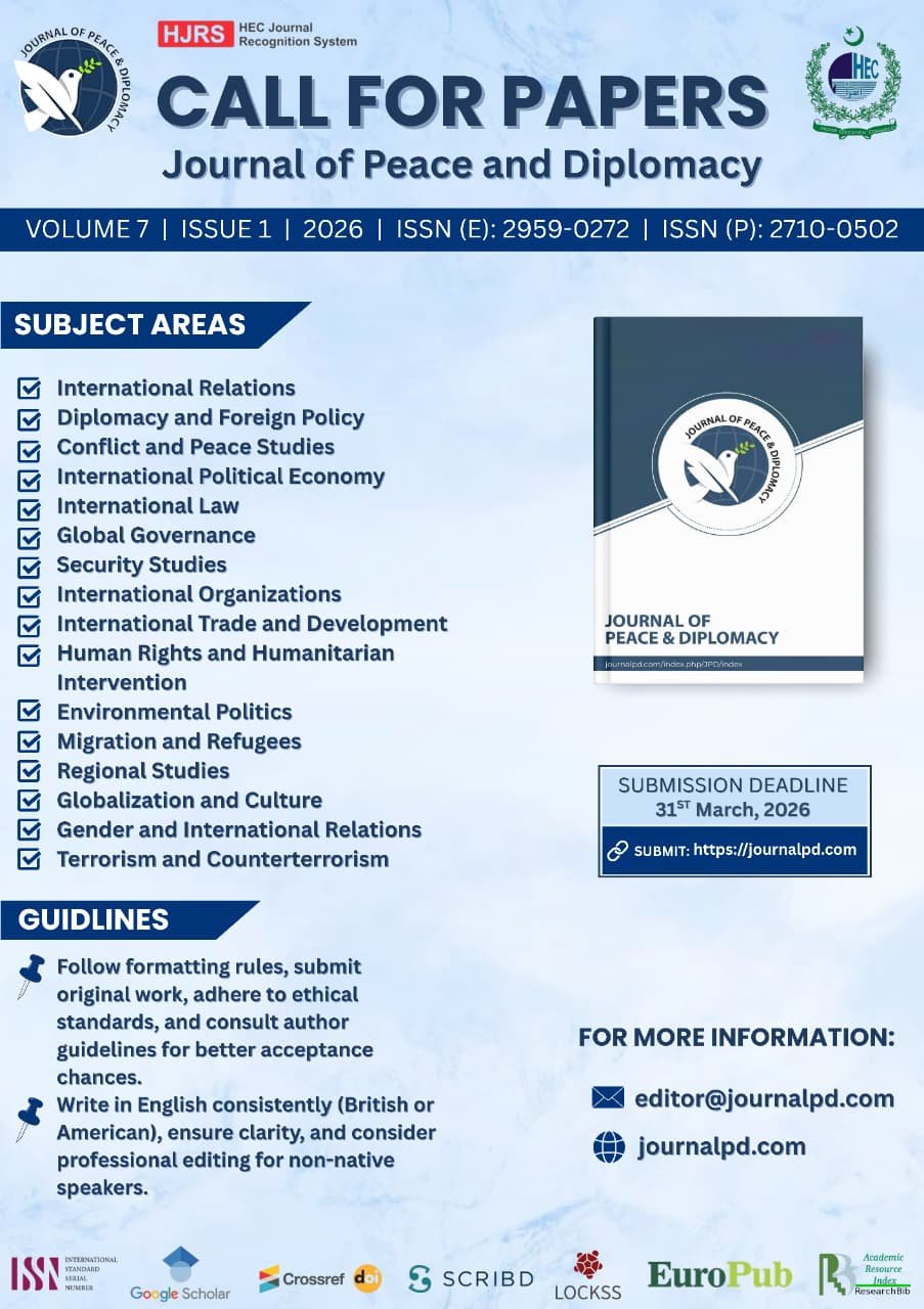 Journal of Peace and Diplomacy by the Diplomatic Insight Publisher Pvt Ltd, Islamabad, Pakistan is licensed under a Creative Commons Attribution 4.0 International License. Based on a work at https://journalpd.com/ojs/index.php/JPD